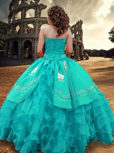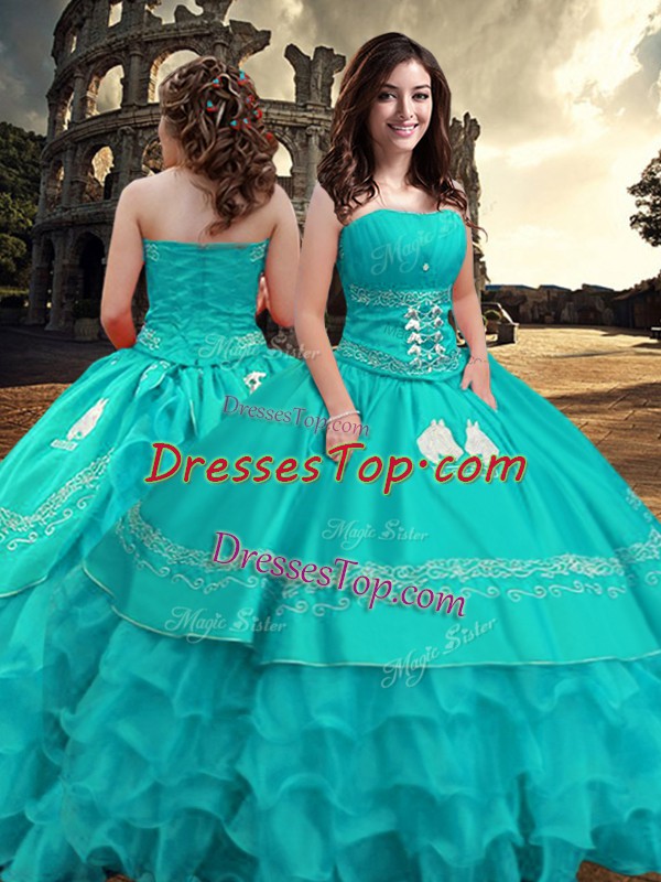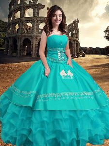 Exceptional Floor Length Zipper Sweet 16 Dress Turquoise for Military Ball and Sweet 16 and Quinceanera with Embroidery and Ruffled Layers
