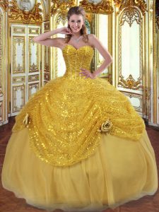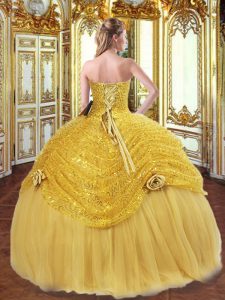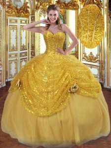 Exceptional Gold Sweetheart Neckline Pick Ups and Hand Made Flower Sweet 16 Quinceanera Dress Sleeveless Lace Up