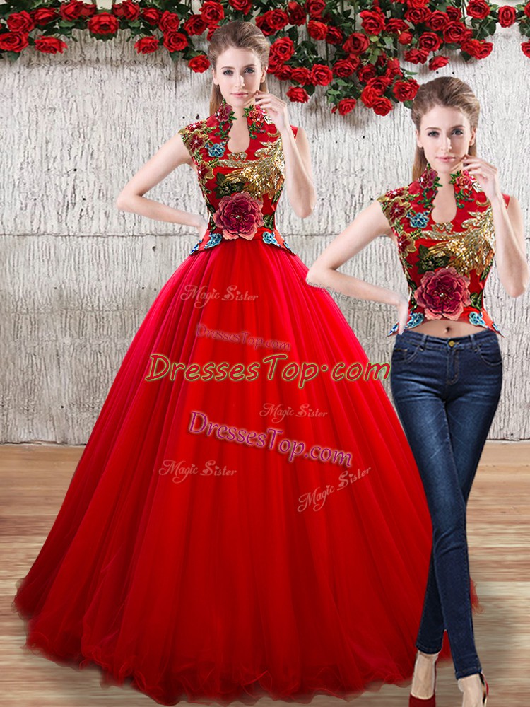 Exceptional Red High-neck Lace Up Appliques 15th Birthday Dress Sleeveless