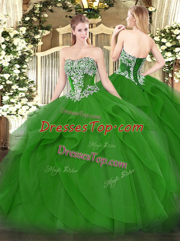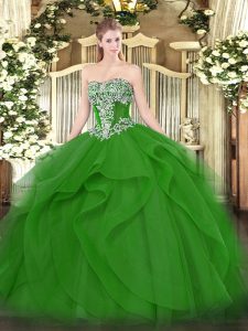 Exceptional Strapless Sleeveless Quince Ball Gowns Floor Length Beading and Ruffles Green Tulle