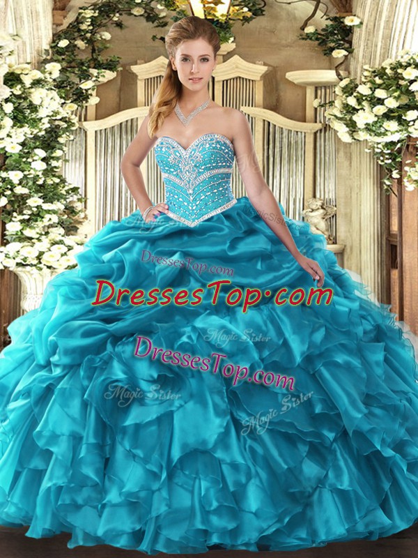 Exceptional Teal Sleeveless Floor Length Beading and Ruffles and Pick Ups Lace Up Sweet 16 Quinceanera Dress