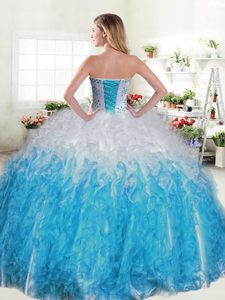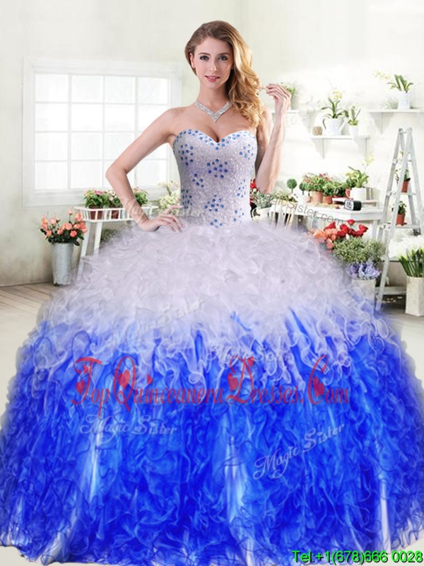 Exceptional Three Piece Sweetheart Sleeveless Quinceanera Gowns Floor Length Beading and Ruffled Layers Blue Organza