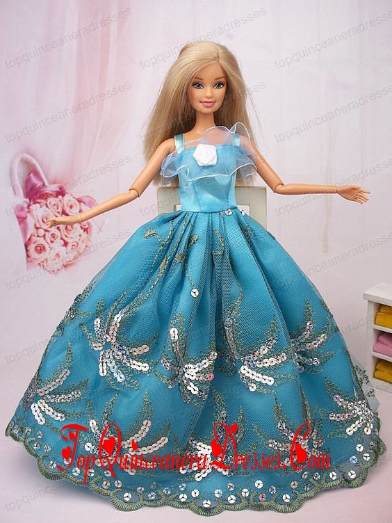 Exclusive Ball Gown Teal Beading Hand Made Flower Barbie Doll Dress