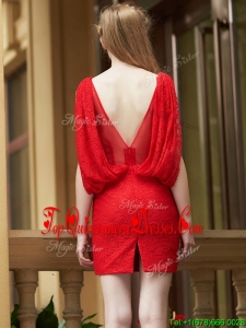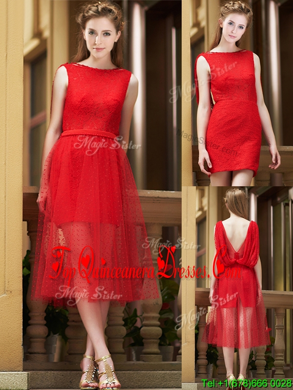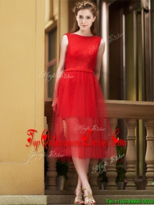 Exclusive Bateau Lace Tea Length Quinceanera Dama Dress in Red
