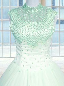 Exquisite Apple Green Tulle Zipper High-neck Sleeveless Floor Length Ball Gown Prom Dress Beading