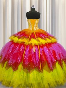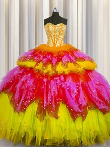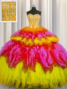 Exquisite Bling-bling Visible Boning Floor Length Multi-color Ball Gown Prom Dress Tulle Sleeveless Beading and Ruffles and Ruffled Layers and Sequins