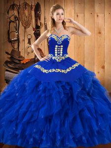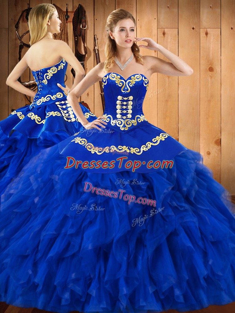 Exquisite Embroidery and Ruffles Quinceanera Gowns Blue Lace Up Sleeveless Floor Length