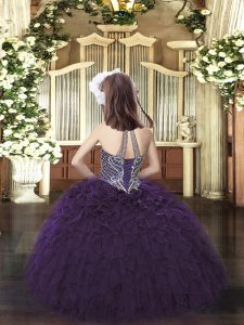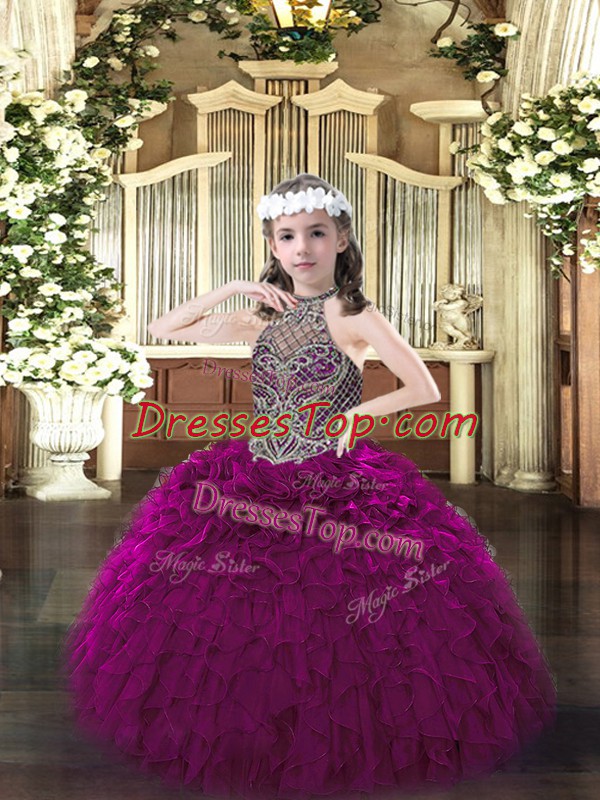 Exquisite Halter Top Sleeveless Organza Kids Formal Wear Beading and Ruffles Lace Up