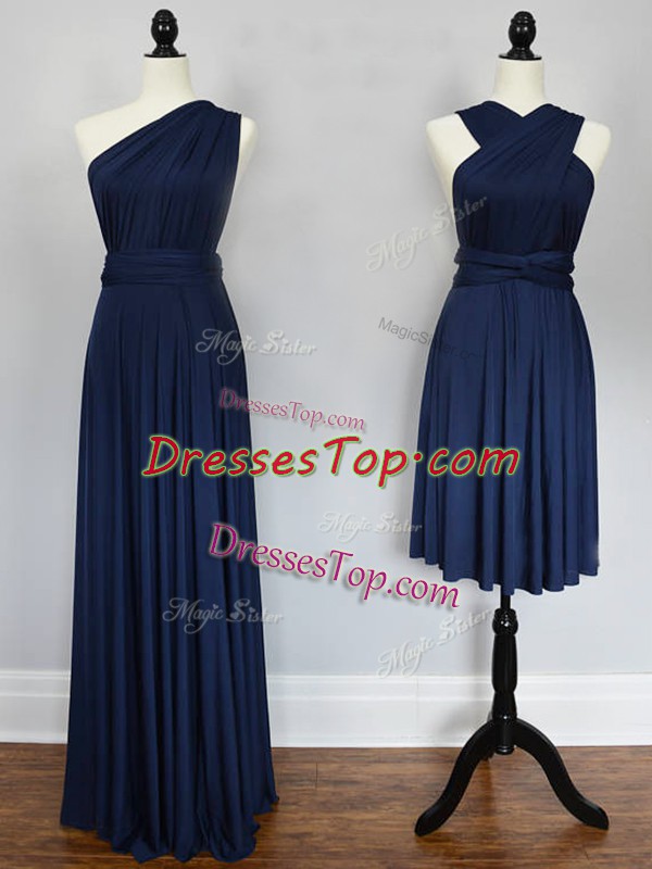 Exquisite Navy Blue Chiffon Lace Up Halter Top Sleeveless Floor Length Damas Dress Ruching