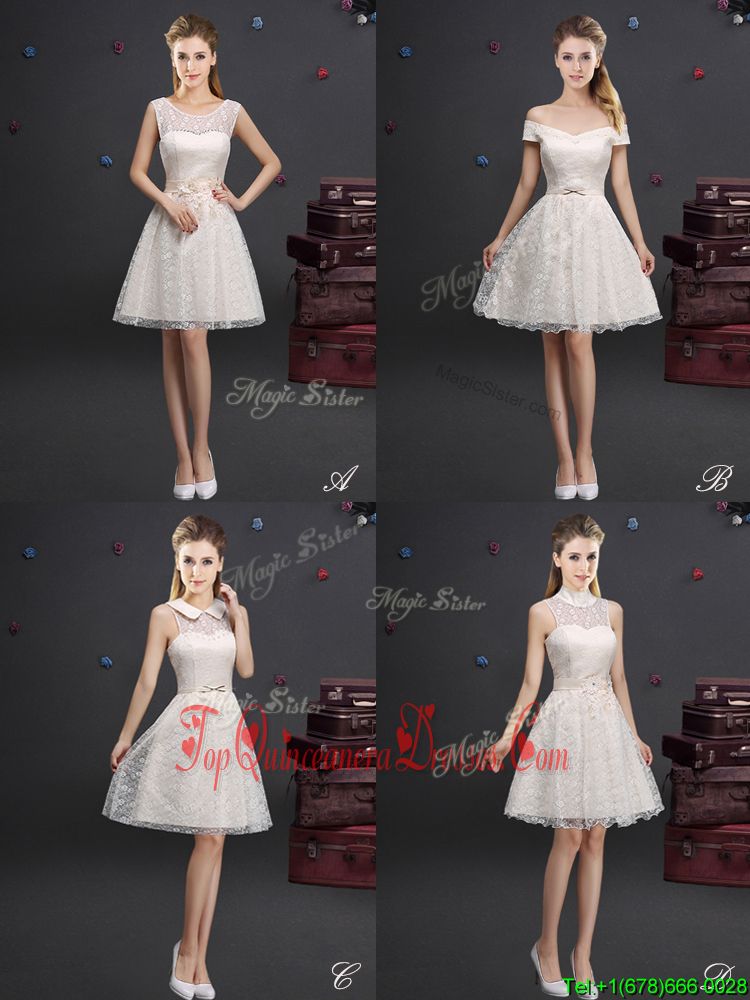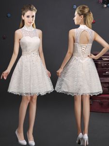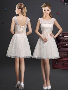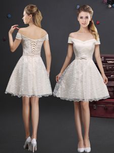 Exquisite Off the Shoulder Sleeveless Lace Knee Length Lace Up Quinceanera Court of Honor Dress in Champagne for with Lace and Appliques