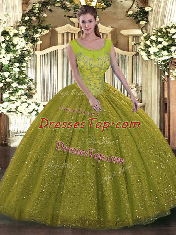 Exquisite Olive Green Tulle Backless Sweet 16 Dresses Sleeveless Floor Length Beading
