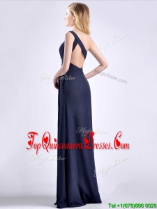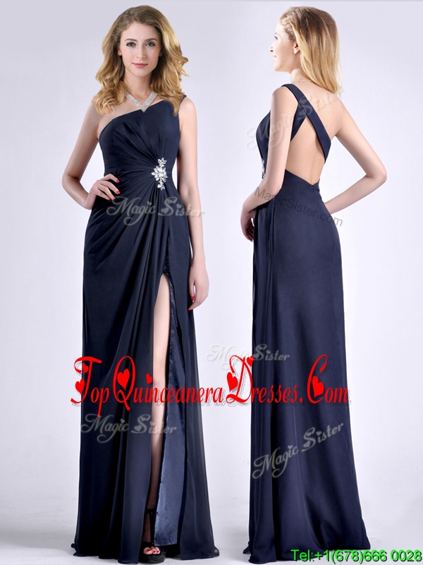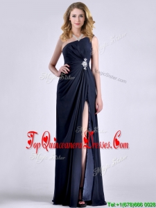 Exquisite One Shoulder Navy Blue Dama Dress with Beading and High Slit
