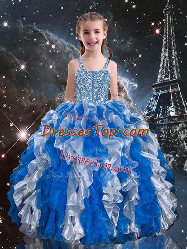 Exquisite Organza Straps Sleeveless Lace Up Beading and Ruffles Evening Gowns in Blue