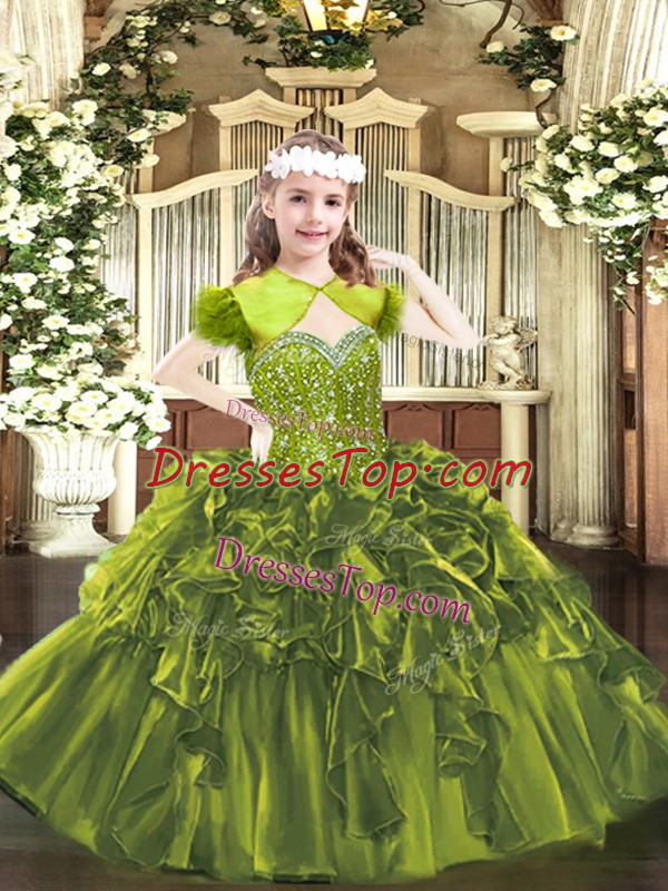 Exquisite Organza Straps Sleeveless Lace Up Beading and Ruffles Kids Formal Wear in Olive Green