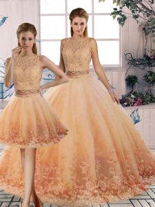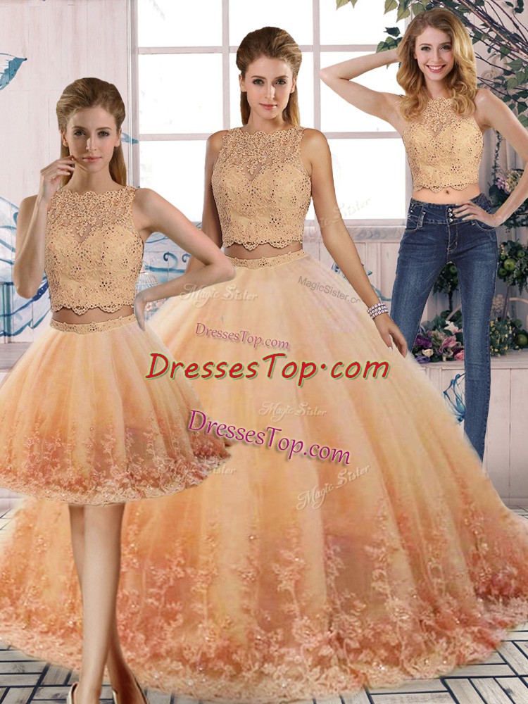 Exquisite Peach Backless Scalloped Lace Vestidos de Quinceanera Tulle Sleeveless Sweep Train
