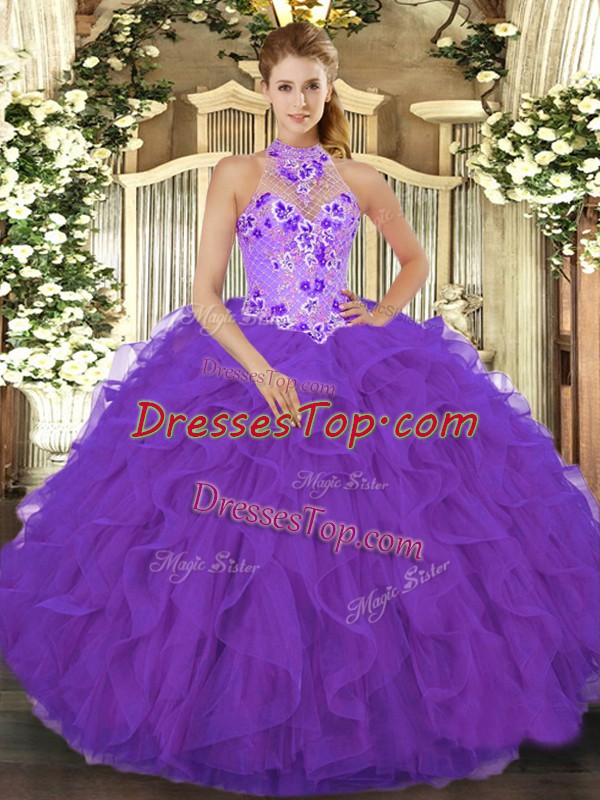 Exquisite Purple Halter Top Neckline Beading and Embroidery and Ruffles Vestidos de Quinceanera Sleeveless Lace Up