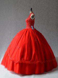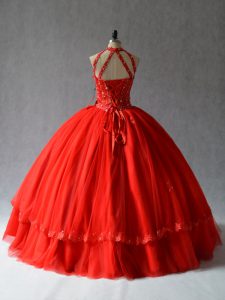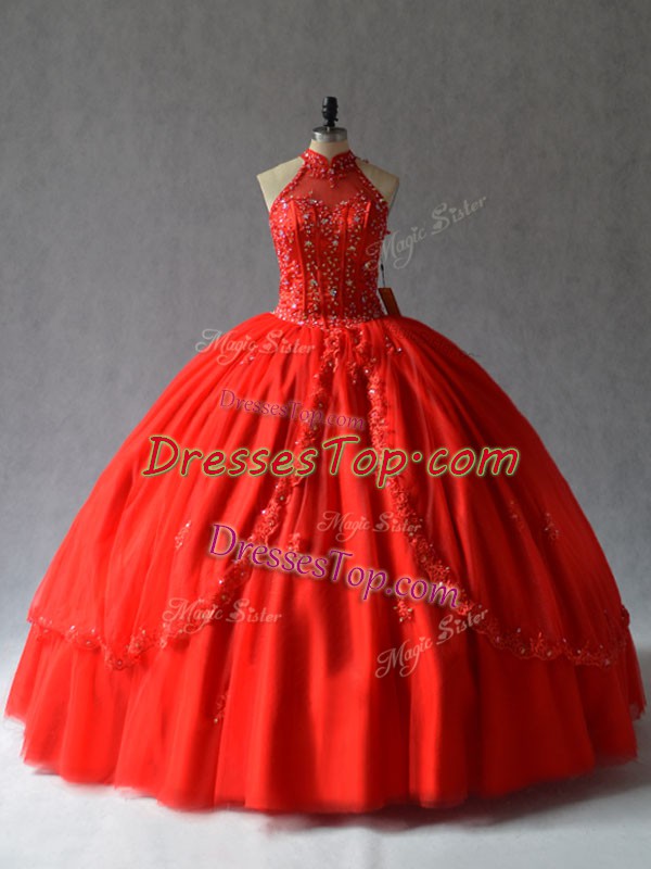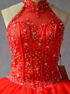 Exquisite Red Halter Top Lace Up Appliques Quince Ball Gowns Sleeveless