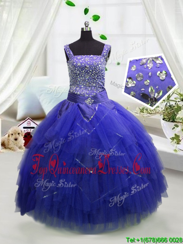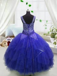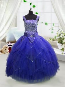 Exquisite Royal Blue Pageant Dress for Womens Party and Wedding Party and For with Beading and Ruffles Straps Sleeveless Lace Up