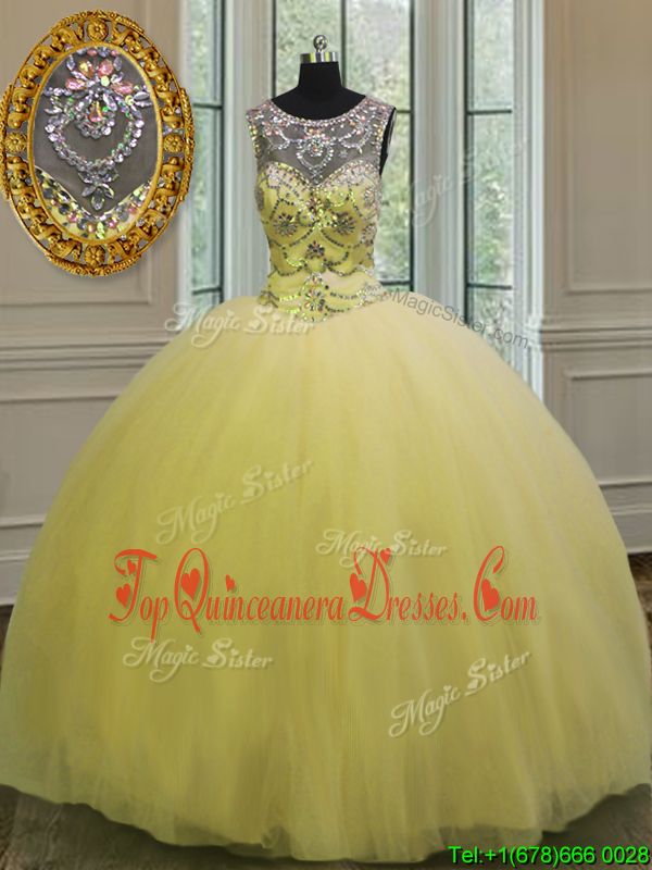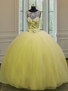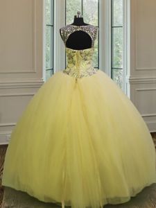 Exquisite Scoop Backless Floor Length Light Yellow 15 Quinceanera Dress Tulle Sleeveless Beading and Appliques