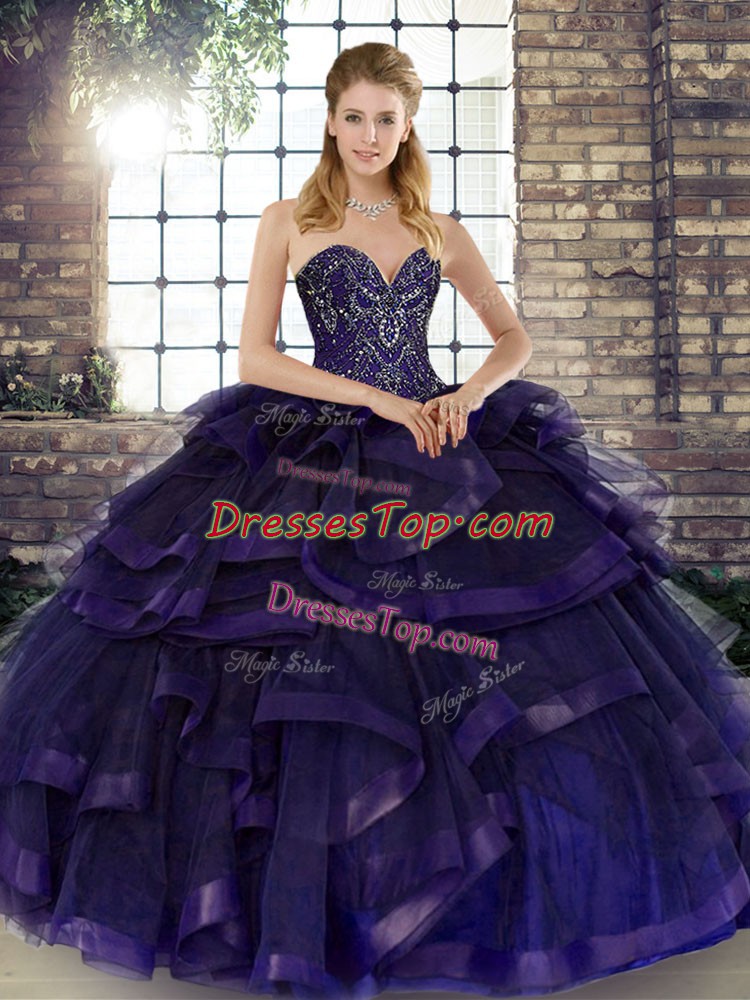 Exquisite Sleeveless Floor Length Beading and Ruffles Lace Up Quinceanera Dresses with Purple