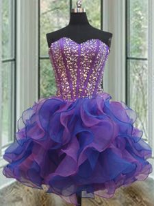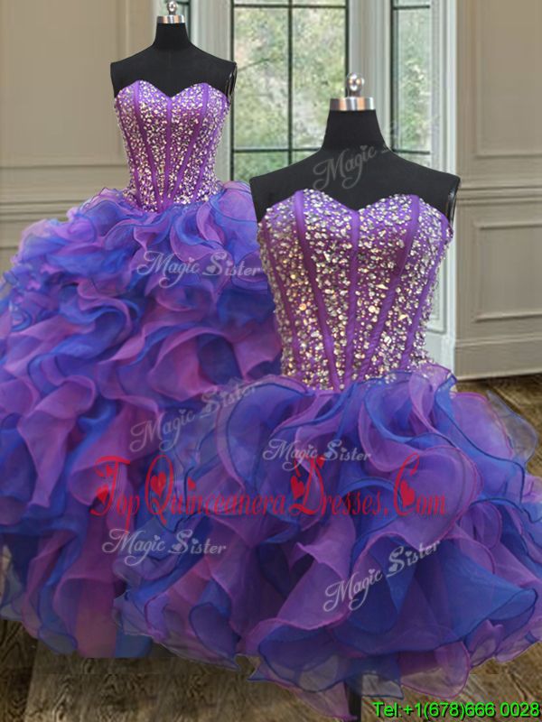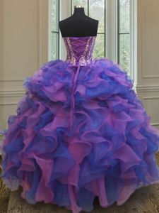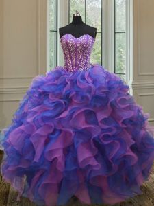 Exquisite Three Piece Floor Length Lace Up Vestidos de Quinceanera Blue and Purple and In for Military Ball and Sweet 16 and Quinceanera with Beading and Ruffles