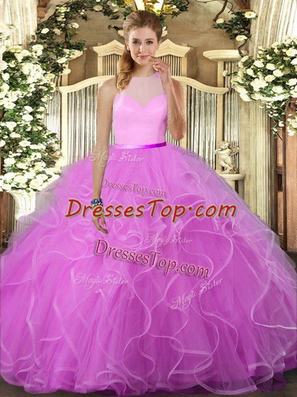 Exquisite Tulle High-neck Sleeveless Backless Ruffles Vestidos de Quinceanera in Lilac