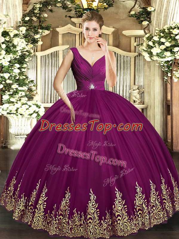 Exquisite V-neck Sleeveless Tulle Sweet 16 Dress Beading and Appliques and Ruching Backless