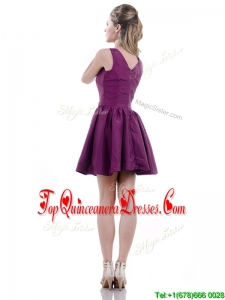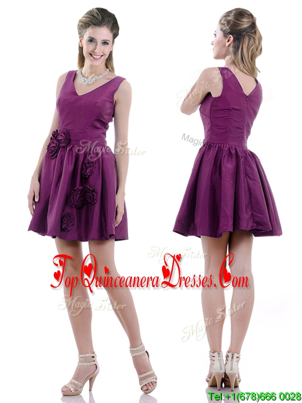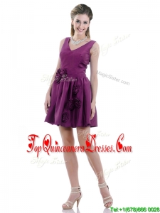 Exquisite V Neck Taffeta Purple Dama Dress with Handcrafted Flowers