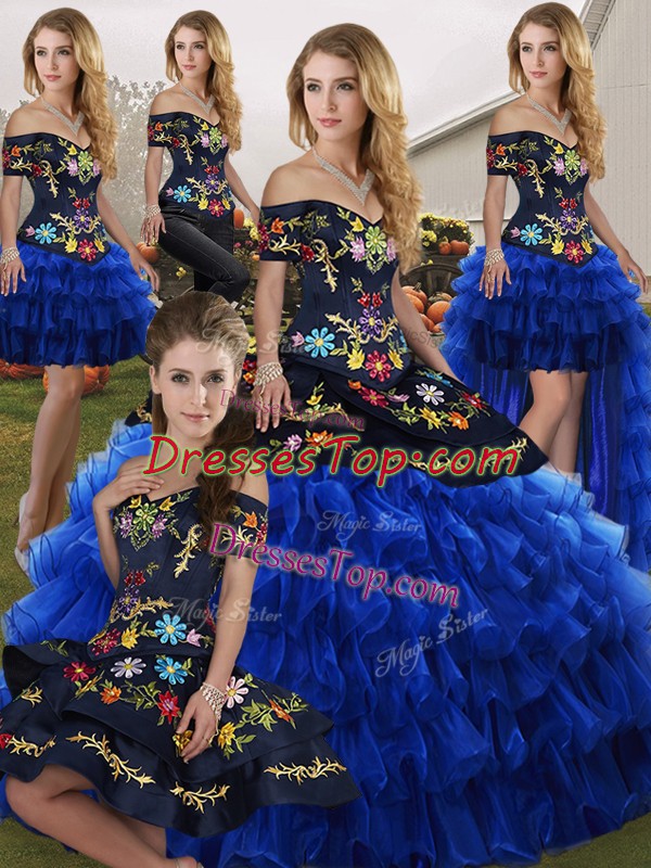 Extravagant Blue And Black Sleeveless Floor Length Embroidery and Ruffled Layers Lace Up Vestidos de Quinceanera