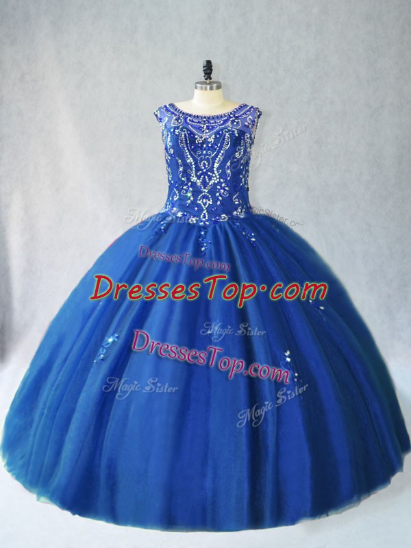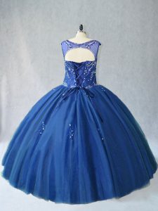 Extravagant Blue Tulle Lace Up Scoop Sleeveless Floor Length Quinceanera Gown Beading