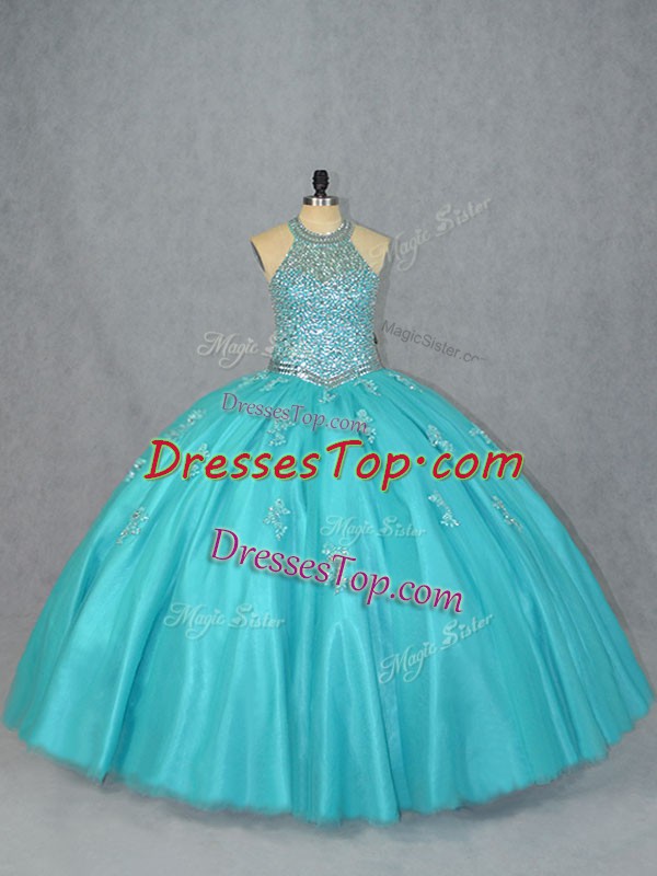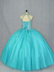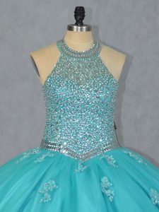 Extravagant Halter Top Sleeveless Lace Up 15 Quinceanera Dress Aqua Blue Tulle