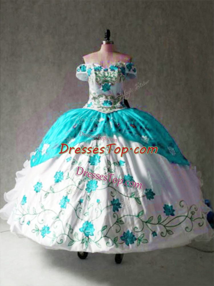 Extravagant Multi-color Lace Up Off The Shoulder Embroidery and Ruffles Sweet 16 Quinceanera Dress Organza and Taffeta Cap Sleeves