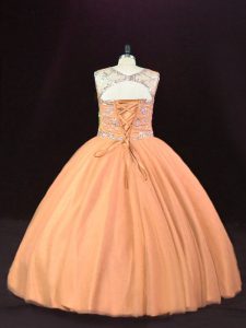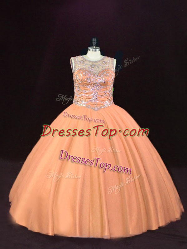 Extravagant Peach Ball Gowns Beading Sweet 16 Quinceanera Dress Lace Up Tulle Sleeveless Floor Length