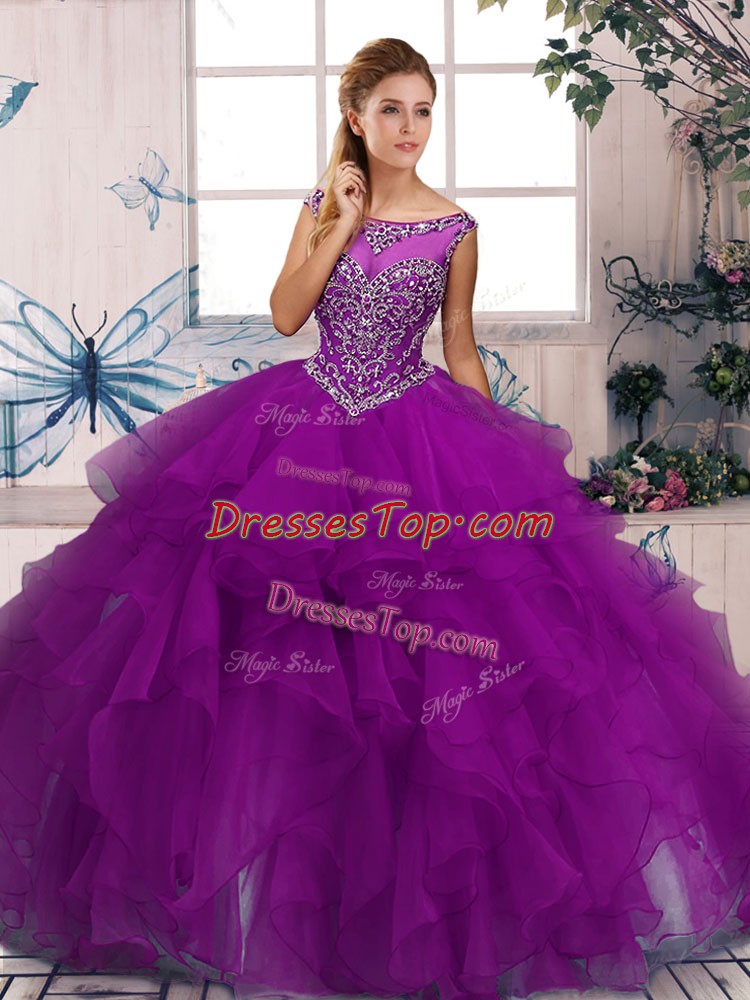 Extravagant Purple Ball Gowns Scoop Sleeveless Organza Floor Length Zipper Beading and Ruffles Quinceanera Gown