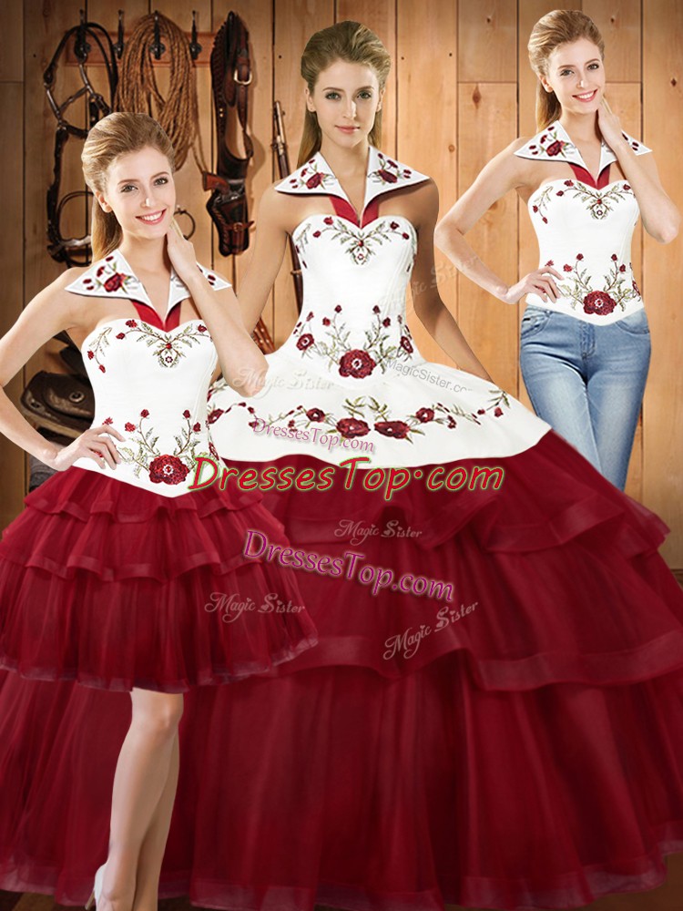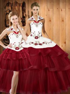 Extravagant Satin and Organza Halter Top Sleeveless Sweep Train Lace Up Embroidery and Ruffled Layers 15th Birthday Dress in Wine Red