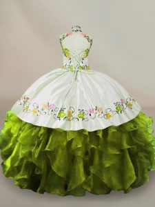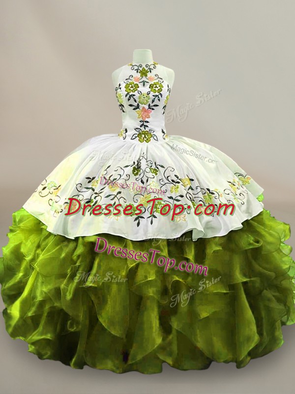 Extravagant Sleeveless Organza Floor Length Side Zipper Ball Gown Prom Dress in Olive Green with Embroidery and Ruffles