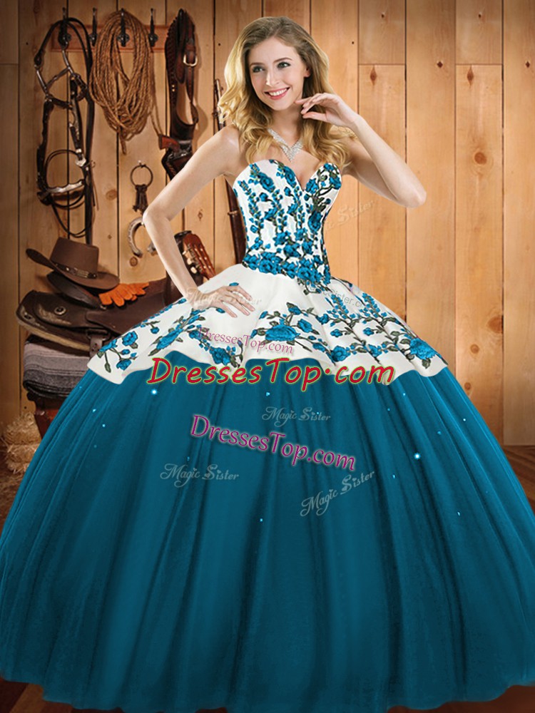 Extravagant Teal Sleeveless Satin and Tulle Lace Up 15 Quinceanera Dress for Military Ball and Sweet 16 and Quinceanera