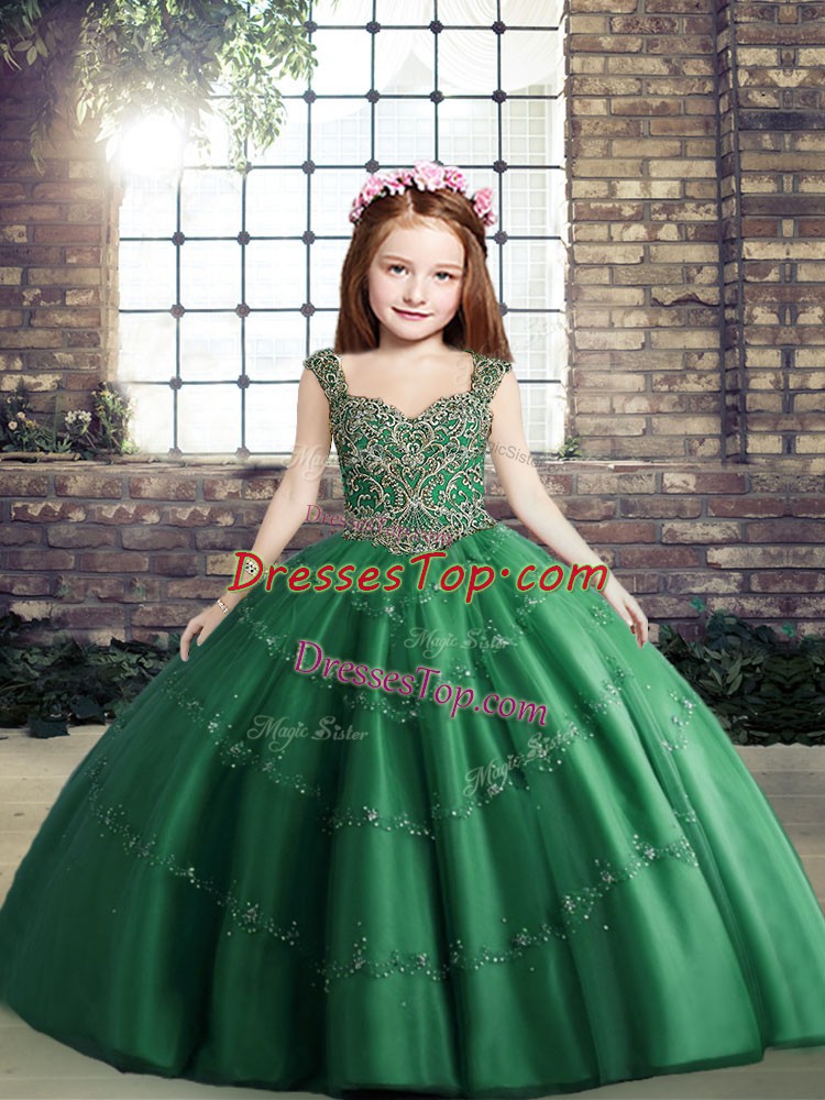 Eye-catching Ball Gowns Pageant Dress Dark Green Straps Tulle Sleeveless Floor Length Lace Up