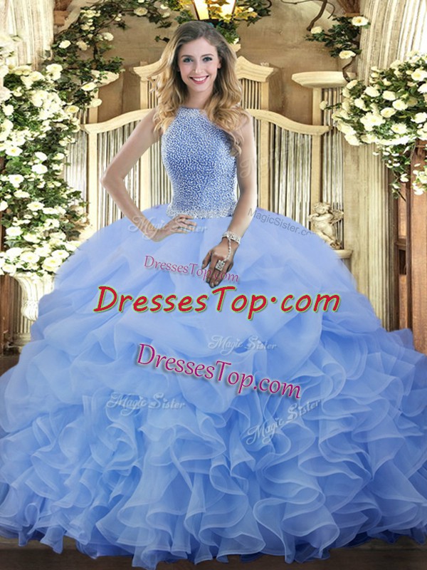 Eye-catching Blue Organza Lace Up High-neck Sleeveless Floor Length Sweet 16 Dress Beading and Ruffles and Pick Ups