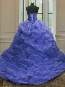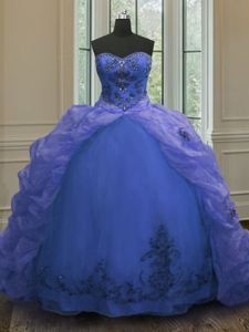 Eye-catching Blue Quinceanera Dresses Military Ball and Sweet 16 and Quinceanera and For with Beading and Appliques and Pick Ups Sweetheart Sleeveless Court Train Lace Up