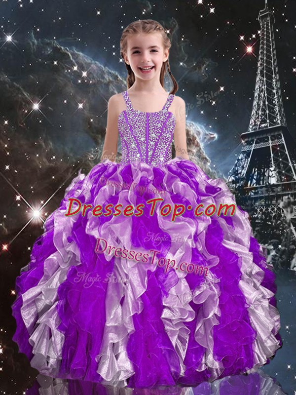 Eye-catching Eggplant Purple Pageant Dress for Womens Quinceanera and Wedding Party with Beading and Ruffles Straps Sleeveless Lace Up