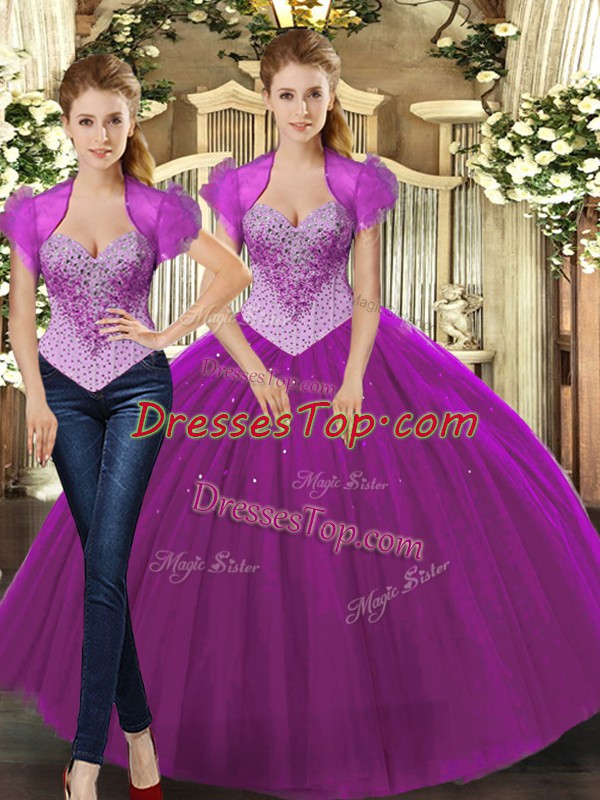 Eye-catching Fuchsia Sleeveless Tulle Lace Up Vestidos de Quinceanera for Military Ball and Sweet 16 and Quinceanera