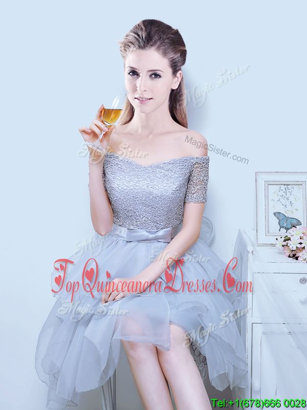 Eye-catching Grey A-line Organza Off The Shoulder Short Sleeves Lace and Ruffles and Bowknot Asymmetrical Lace Up Vestidos de Damas