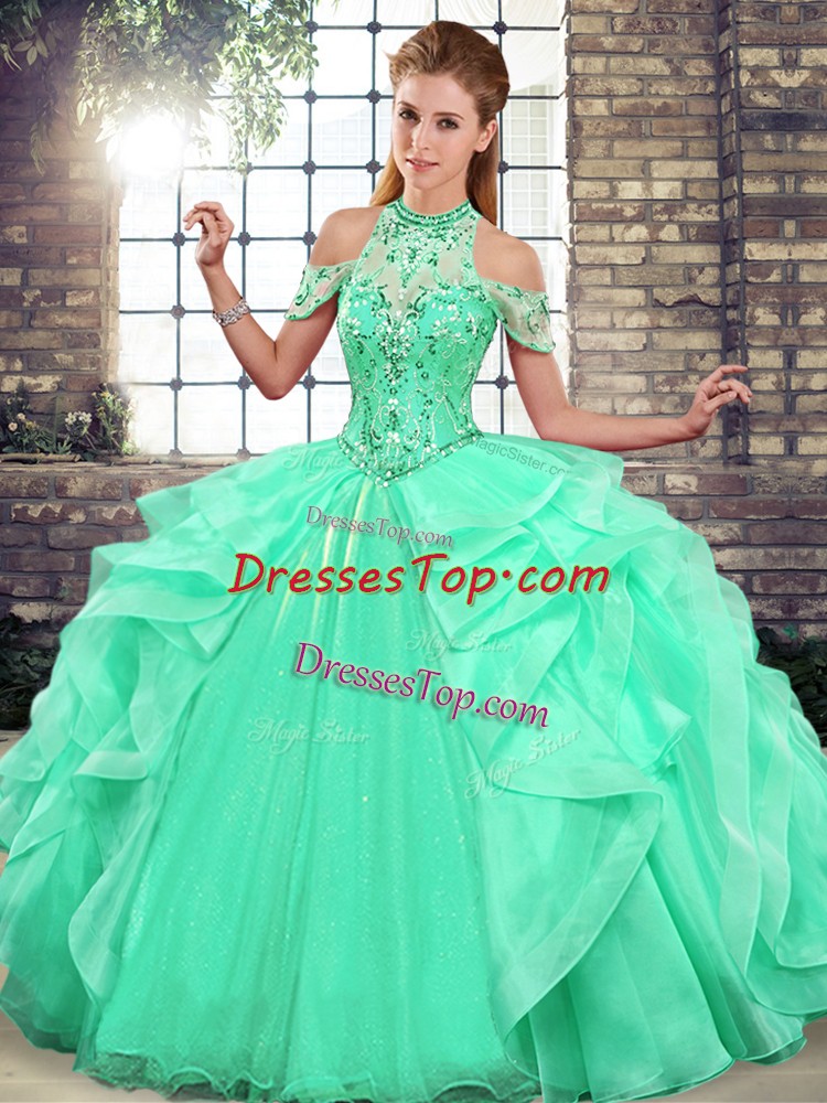 Eye-catching Halter Top Sleeveless Organza 15th Birthday Dress Beading and Ruffles Lace Up