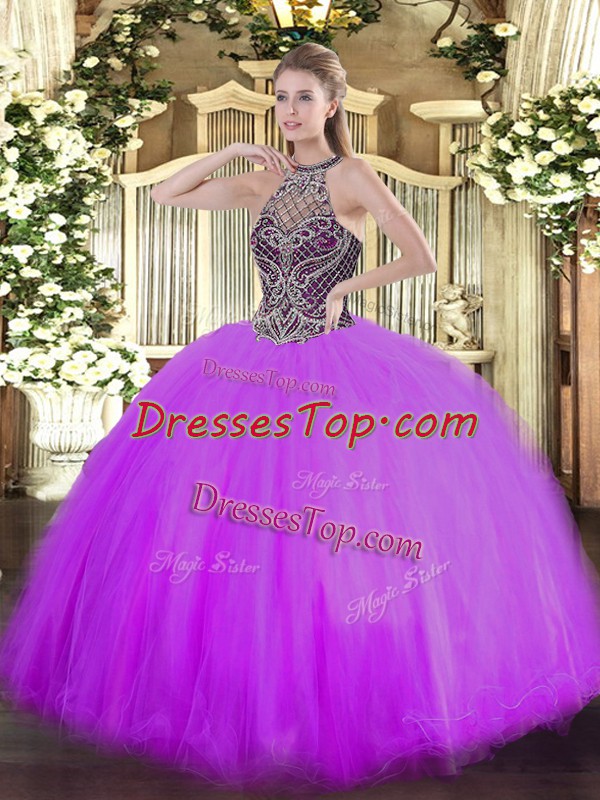 Eye-catching Halter Top Sleeveless Tulle 15th Birthday Dress Beading Lace Up