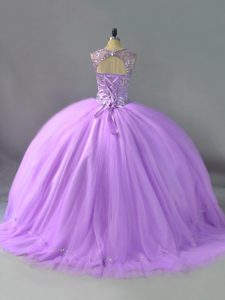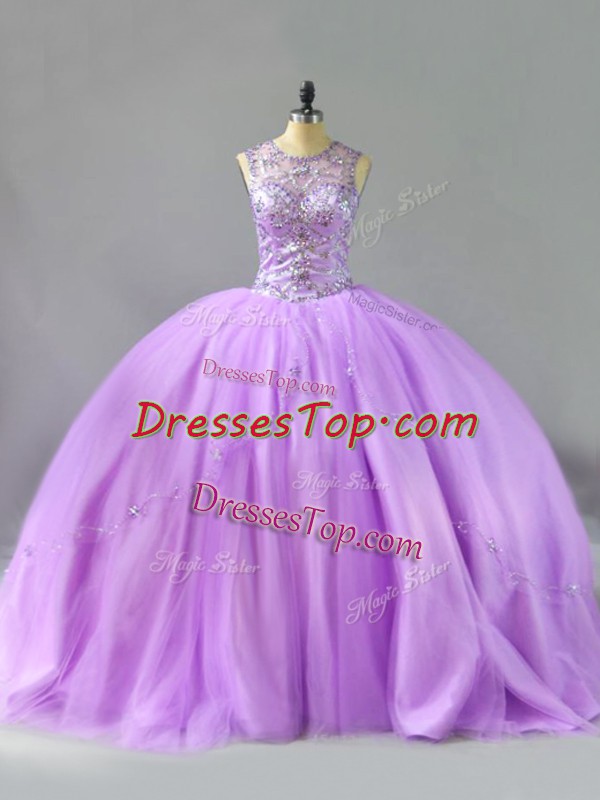 Eye-catching Lavender Ball Gowns Scoop Sleeveless Tulle Floor Length Lace Up Beading Quinceanera Dresses