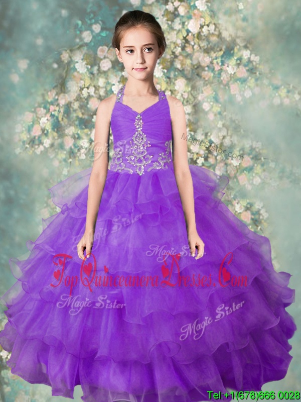 Eye-catching Lavender Organza Zipper Halter Top Sleeveless Floor Length Pageant Gowns For Girls Beading and Ruffled Layers