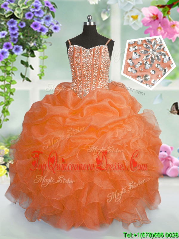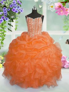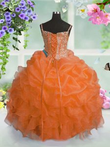 Eye-catching Orange Spaghetti Straps Lace Up Beading and Ruffles and Pick Ups Kids Pageant Dress Sleeveless