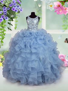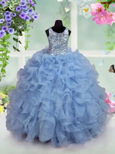Eye-catching Scoop Light Blue Organza Zipper Little Girl Pageant Gowns Sleeveless Floor Length Ruffles and Sequins