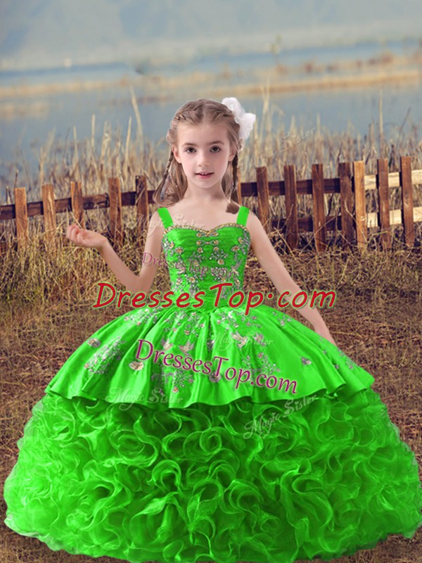Fabric With Rolling Flowers Lace Up Straps Sleeveless Child Pageant Dress Sweep Train Embroidery